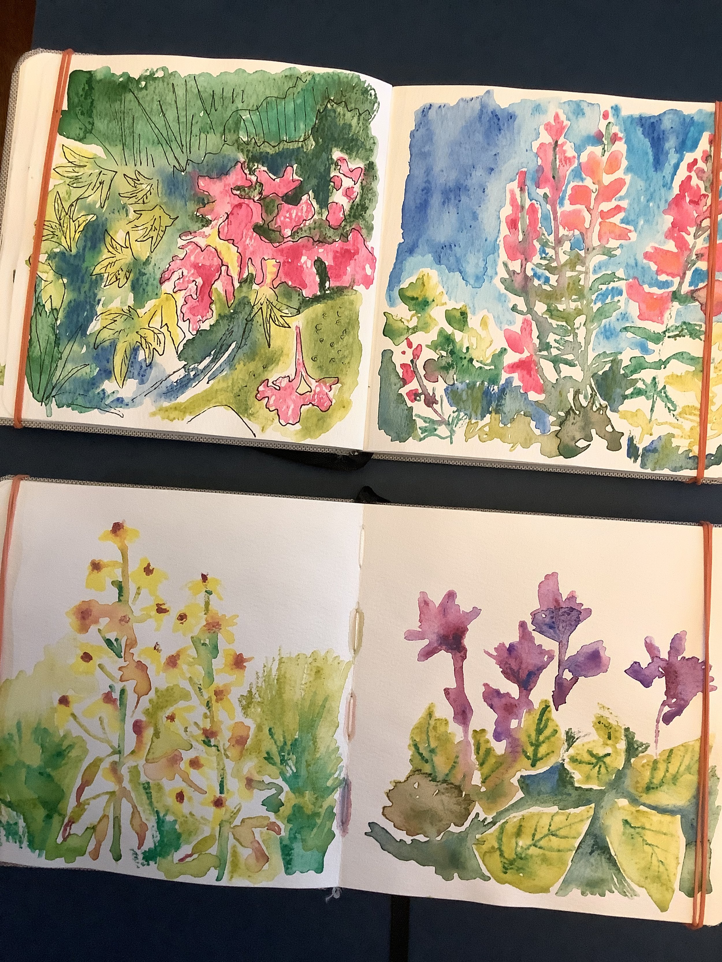Another thing I like to do this time of year is to explore other activities that are art adjacent. In particular right now I have been seeing a lot of online content around Valentine’s Day. Normally this isn’t a holiday that I would decorate for, but this year I feel inspired by the crafts that I have been seeing and last weekend I started with making a paper heart garland. Cutting the strips of paper and stapling them into heart shapes is both relaxing and it’s fun to look at the hearts hanging and meandering along the shelves of my dining room studio. I’m not sure if I will make other decorations, but what I can say is that by doing something different creatively it fuels my desire to be artistic, but in a gentler way. And this gentleness gives me the space to let other creativity in. This desire for gentleness is also why I like to spend this time of year working in my sketchbooks.
